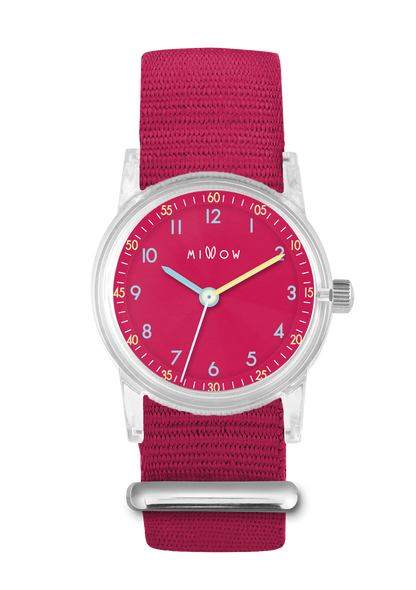 Its transparent case with its pop colored dial is waterproof and ultra light (the case weighs is only 3 grams). Its design also comes with the playful design to help reading time easily. Its colored-coordinated hands and digits make it easier to learn to tell the time.
