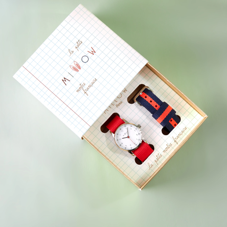 The striped red strap is easily interchangeable to fit any style.